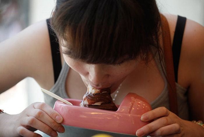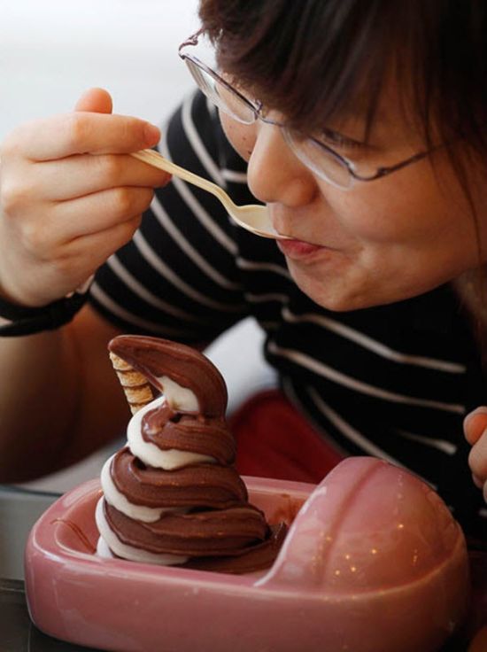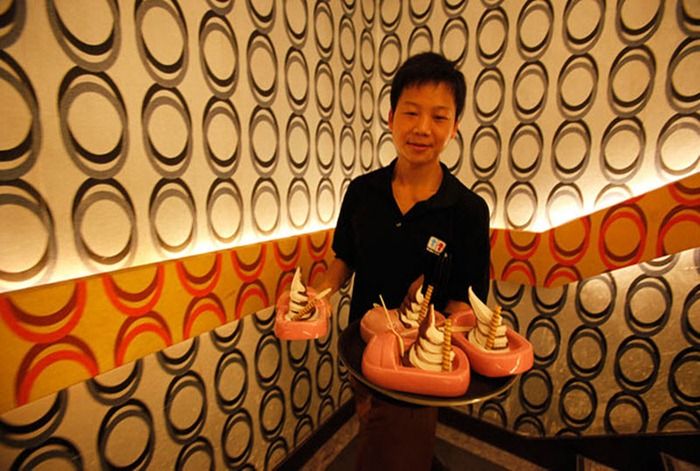 ការរៀបចំក្នុងហាង កៅអីធើ្វពីចានបង្គន់ និងតុវិញ គឺធើ្វអំពី បាញ់ញ័រ(អាងត្រំាទឹកក្នុងបន្ទប់ទឹក) ចំនែក ឯម្ហូបវិញគឺមានរាងដូចលាមកទំាងអស់ប៉ុនែ្តវាមានរសជាតិឆ្ងាញ់ពិសារ។