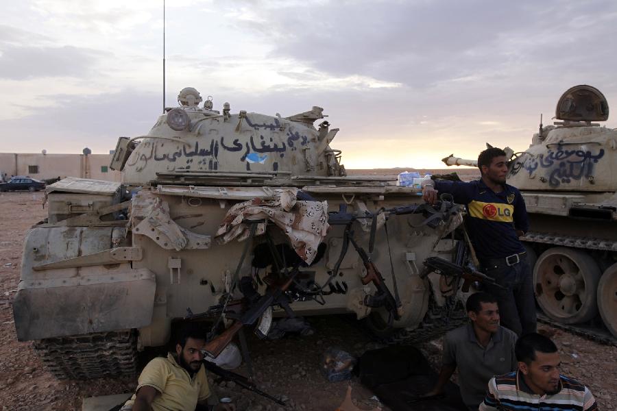 កងកម្លាំងប្រឆាំងនឹងលោកកាដាហ្វីកំពុងសម្រាកក្បែររថក្រោះ នាកន្លែងត្រូតពិនិត្យ។