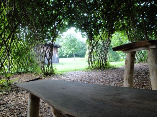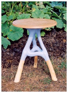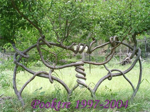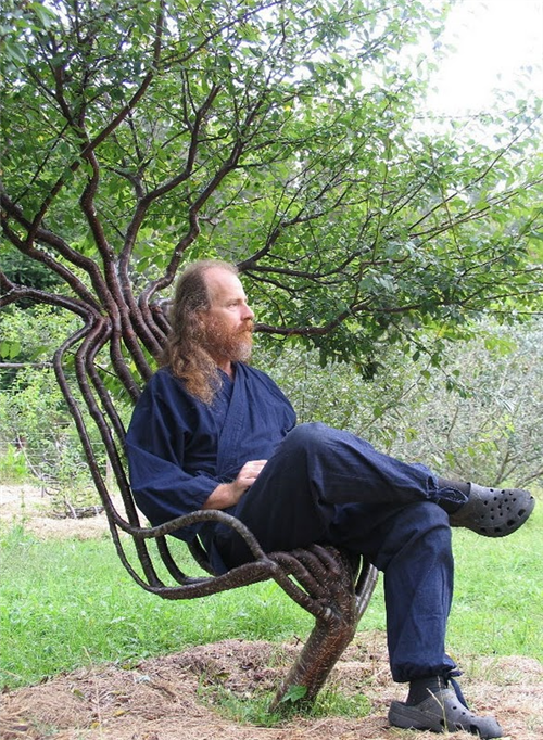 សិល្បៈករ Peter Cook កំពុងអង្គុយលើដើមឈើដែលត្រូវបានបត់ពត់ជាកៅអី