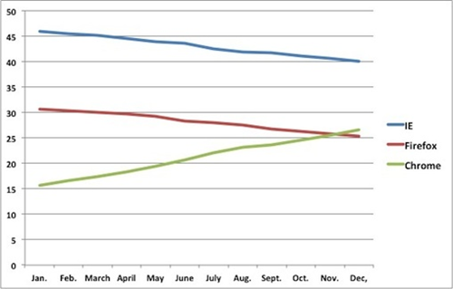 មួយដែលឆ្លុះបញ្ចាំងពីទិសដៅស្របគ្នា អំពីការធ្លាក់ចុះនៃភាគរយរបស់ IE និង Firefox និង