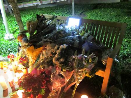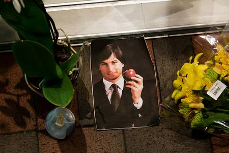 ផ្កានិងរូបថតរបស់ Steve Jobs ត្រូវបានដាក់នៅតាមទីកន្លែងជាច្រើនដើម្បីជាការរំលឹកដល់
