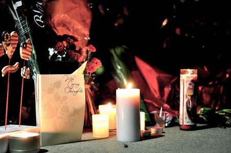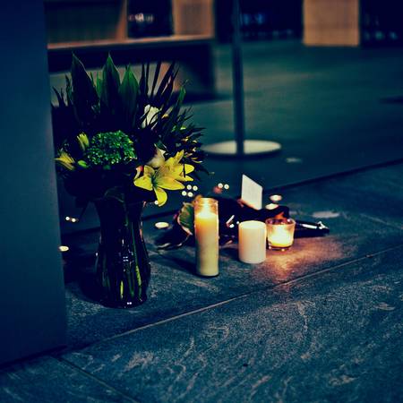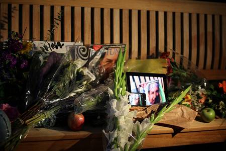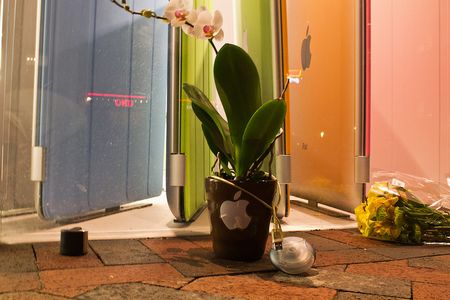 ទាននិងផ្កាជាច្រើនត្រូវបានដាក់នៅពេញនៃមុខទីស្នាក់ការរបស់ Apple ។