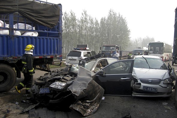 ដែលបង្កដោយរថយន្តក្រុងដែលបានមកបុកនិងឡាននៅក្នុងផែនៃទីក្រុង Tianjin។