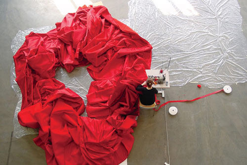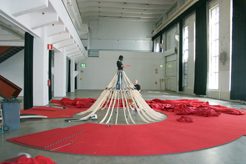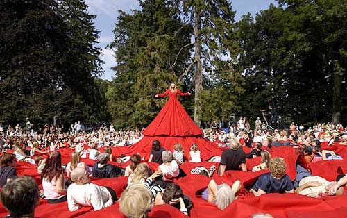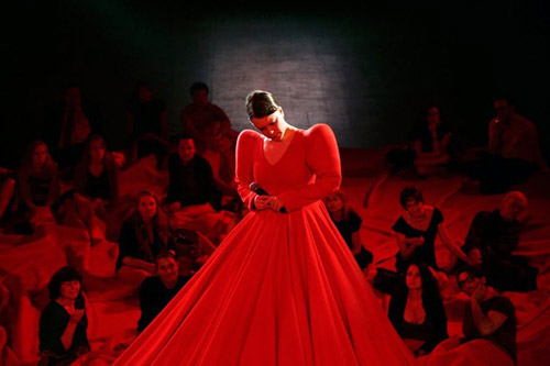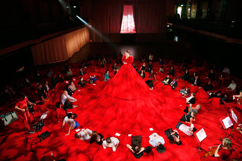 មើលពីចម្ងាយ រ៉ូបយក្សក្រហមនេះហាក់ដូចជាសាលប្រគំតន្ដ្រីមួយដែលត្រូវបានបង្រួមតូច។