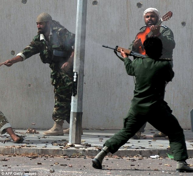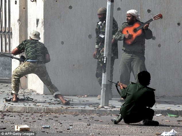 ម្នាក់ដែលលេងហ្គីតាក្នុងសមរភូមិ ខណៈពេលដែលការបាញ់ប្រហារគ្នាកំពុងកើតឡើង