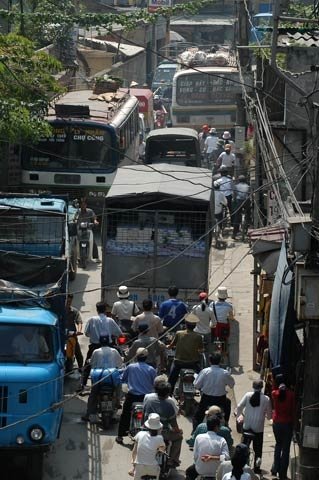 ទោះបីជាក្នុងផ្ឡូវចង្អៀតយ៉ាងណាក៏ដោយ ក៏ប៉ុន្តែឡានធំៗក៏ខំប្រជ្រាតគ្នាចូល