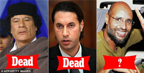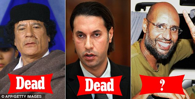 សម្លាប់។ ខាងស្តាំគឺ កូនប្រុសម្នាក់ទៀតឈ្មោះ Saif al-Islam ដែលជាកូនប្រុសសណព្វចិត្ត