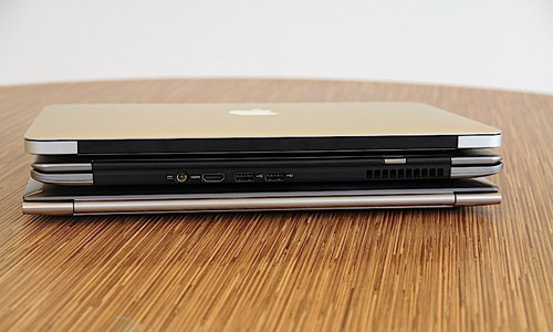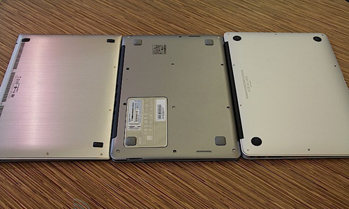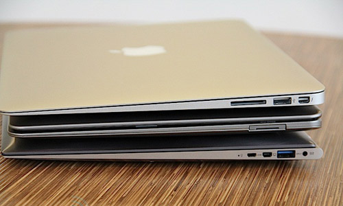 មានកំរាស់ស្តើងជាង MacBook Air (លើ) និង Asus Zenbook (ក្រោម) ដែលសុទ្ធតែមាន