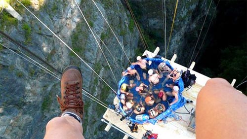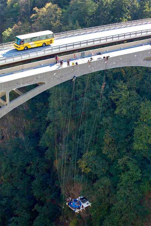 ទឹកមួយរួចយកខ្សែកាបព្យួរពីលើស្ពាន Gueuroz ។ ក្រុមយុវវ័យដែលមានគ្នា ២៥ នាក់