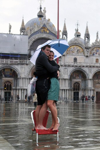 គូសង្សារមួយគូបានឆ្លៀតឱកាសថតរូបជាមួយគ្នានៅទីលាន St Mark ក្នុងក្រុង Venice នៅពេលទឹកជំនន់កំពុងឡើងខ្ពស់។
