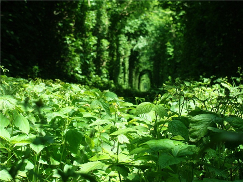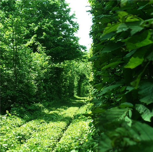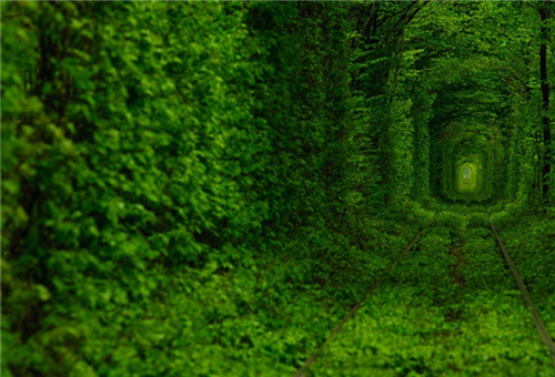 ដើមឈើព័ទ្ធជុំវិញ រួមទំាងមានផ្លូវរទេះភ្លើងនៅចំពាក់កណ្តាលមើលទៅវាហាក់បីដូច