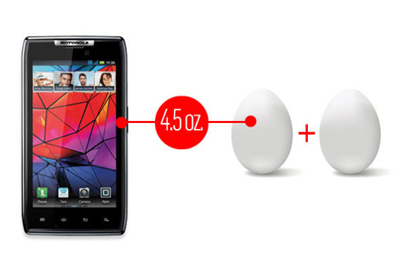 Motorola Droid Rarz មានទំងន់ស្មើត្រឹមតែ ស៊ុតធំចំនួនពីរប៉ុណ្ណោះ (១២៨ ក្រាម)។