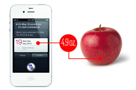 iPhone 4S ទំងន់ ១៣៩ក្រាម,ស្មើទៅនឹងទំងន់របស់ផ្លែប៉ោមប្រភេទមធ្យមមួយផ្លែ ។