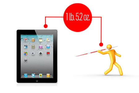Apple iPad 2 ទំងន់ ៦៨៩ក្រាម គឺប្រហាក់ប្រហែលនឹងលំពែងសំរាប់ចោលនៅក្នុងកីឡា