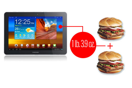 Samsung Galaxy Tab 10.1 មានទំងន់ ៦០០ក្រាម គឺប្រហាក់ប្រហែលគ្នានឹងទំងន់នៃនំ