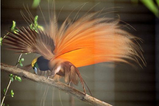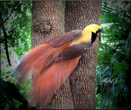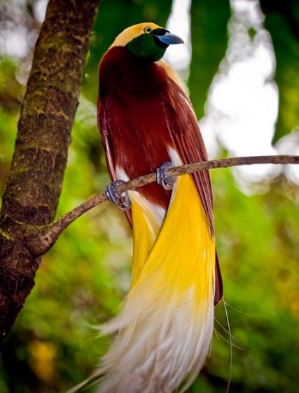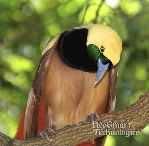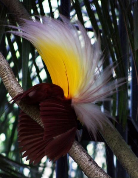 ក្បាលរបស់បក្សីសួគ៌មានពណ៌លឿង និងមានរោមដ៏ស្រស់ស្អាត ពិសេសគឺនៅត្រង់កន្ទុយ