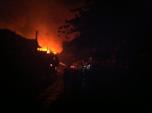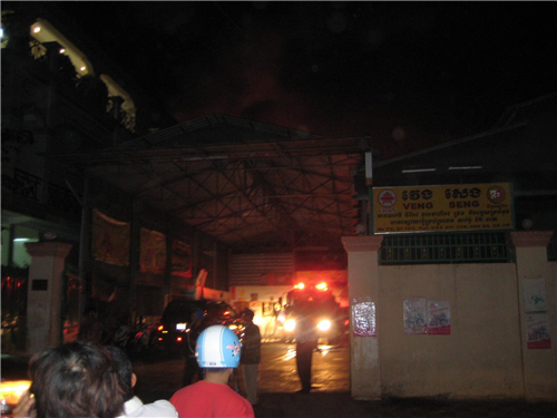អាធ្រាត គឺឆេះផ្ទះ៦ខ្នងទៅហើយ។ រថយន្តពន្លត់អគ្គីភ័យជាច្រើនគ្រឿង កំពុងធ្វើការ