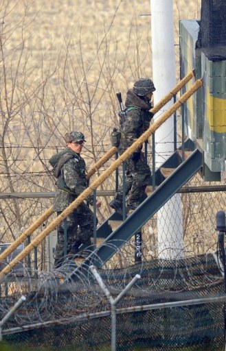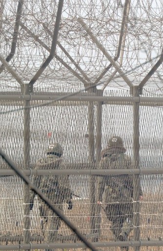 ទាហានកូរ៉េខាងត្បូងពីរនាក់កំពុងដើរល្បាតនៅក្បែររបងលួស ជិតតំបន់គ្មានយោធា