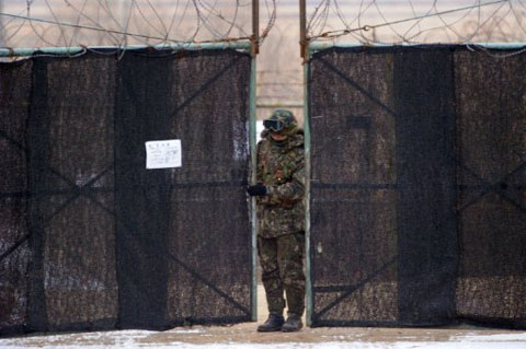 ទាហានម្នាក់របស់កូរ៉េខាងជើងកំពុងការពារ និងហាមមិន
