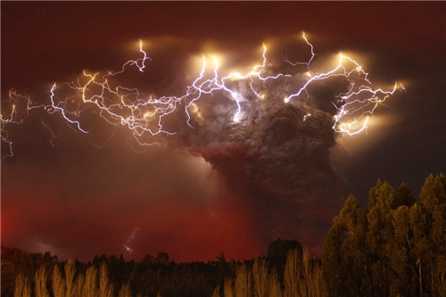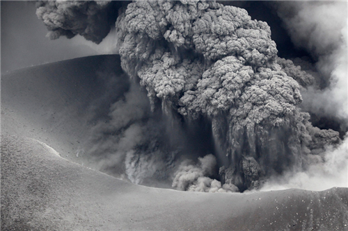 ពន្លឺផ្លេកបន្ទោរបានជះពន្លឺទៅក្នុងផ្សែងពពកដ៏ខ្មៅងងឹតដែលបង្កើតឡើងដោយភ្នំភ្លើង