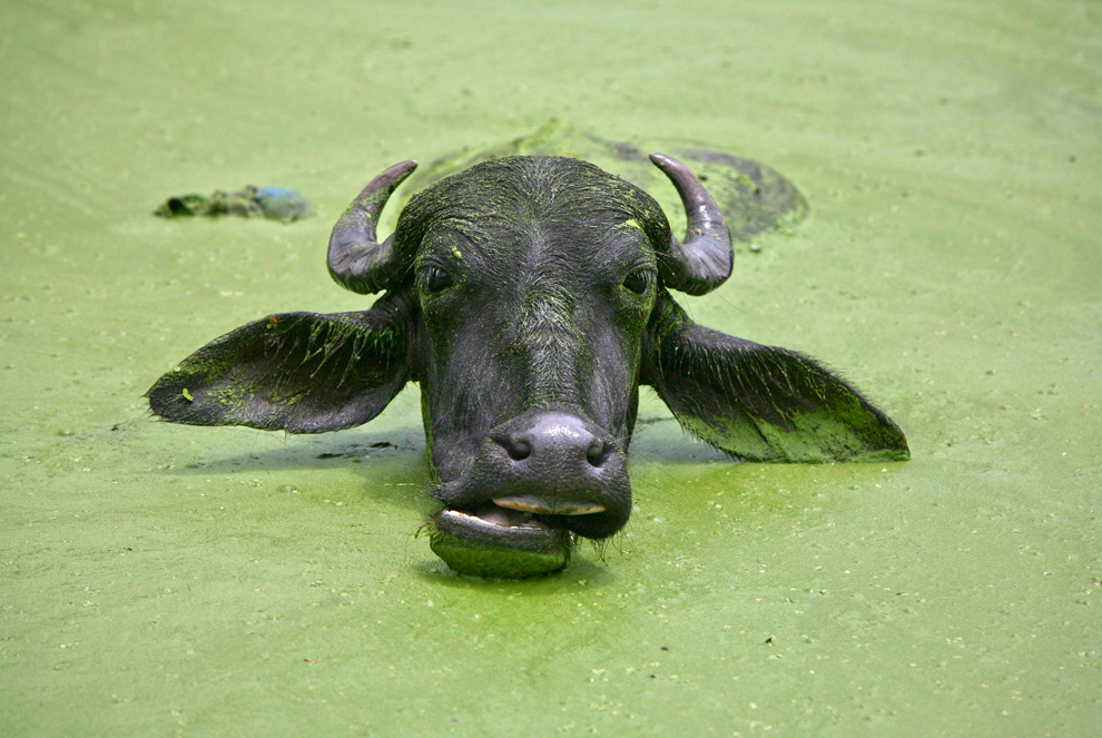 សត្វក្របីមួយក្បាលនេះកំពុងតែត្រាំខ្លួននៅក្នុងបឹងមួយនៅជាយក្រុង Jammu, Kashmir