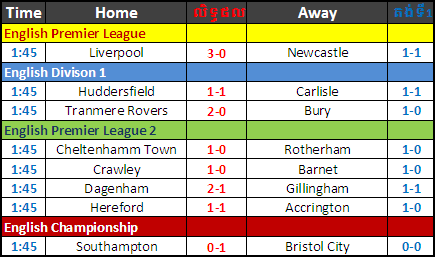 លទ្ធផលបាល់ទាត់ថ្ងៃទី 30/12/2011