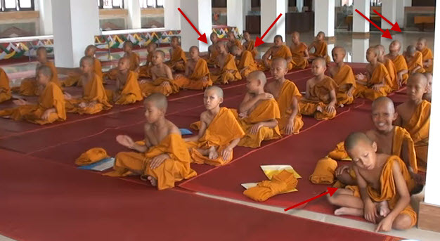 អង្គុយស្តាប់ធម៌។ នេនតូចៗបានអង្គុយងក់ចុះឡើង និងនេនខ្លះទៀត សឹងលក់តែម្តង។