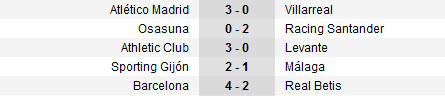 លទ្ធផលការប្រកួតបាល់ទាត់អេស្បាញ La Liga ថ្ងៃសៅរ៍ ទី១៤ និងថ្ងៃអាទិត្យ ទី១៥ ខែមករា ឆ្នាំ២០១២