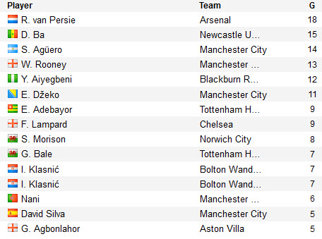 តារាង Top Scorers ក្នុងក្របខណ្ឌបាល់ទាត់ English Premier League