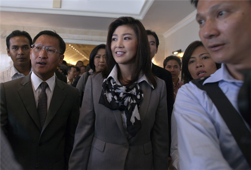 នាយករដ្ឋមន្រ្តីថៃយ៉ីងឡាក់ ស៊ីណាវាត់ត្រាបានធ្វើការចាកចេញពីប្រលានយន្តហោះទីក្រុង
