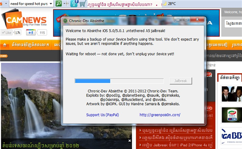 - ពេលវេលាធ្វើការ Jailbreak នេះ គឺយូរបន្តិចតំរូវអោយធ្វើការរង់ចាំដល់បន្ទាត់ពណ៌ខៀវ