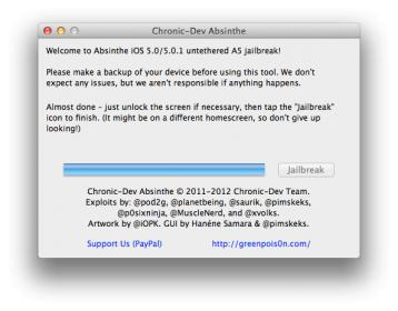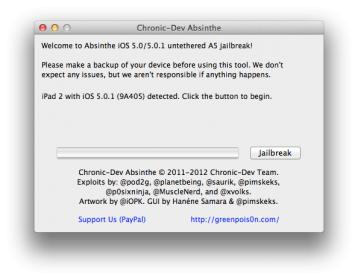 មុខនេះ។ កម្មវិធី Absinthe នេះសំរាប់ iPhone 4S គឺប្រើ iOS 5.0 និង 5.0.1 សំរាប់ iPad 2