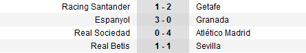 លទ្ធផលការប្រកួតបាល់ទាត់អេស្បាញ La Liga ថ្ងៃសៅរ ទី២១ និងថ្ងៃអាទិត្យ ទី២២ ខែមករា ឆ្នាំ២០១២