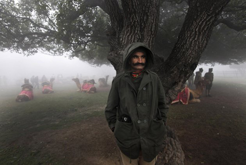 ទាហានការពារព្រំដែនមួយក្រុមកំពុងរង់ចាំនៅក្រោមដើមឈើ។