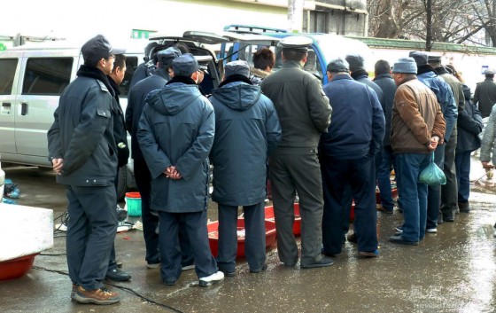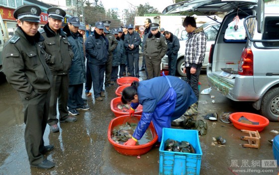ខណៈនោះមន្រ្តីប៉ូលីសពង្រឹងច្បាប់បាននាំគ្នាជាច្រើនមកឈរនៅពីមុខអ្នកលក់គ្រឿងសមុទ្រ