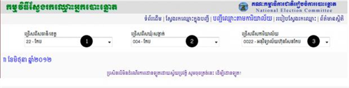 ២. ជ្រើសរើសឈ្មោះឃុំ/សង្កាត់ដែលអ្នកបានទៅចុះឈ្មោះ (រើសក៏បាន តែបើមិនរើសយកវាទេ ការស្វែងរកពិតជាបង្ហាញអាចយឺតជាងធម្មតា)