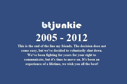 ធំជាងគេបង្អស់លើពីភពលោក។ ក្នុងទំព័រ Homepage របស់ខ្លួន Btjunkie បានសរសេរថា៖ នេះគឺជាសម្តីចុងក្រោយរបស់យើងខ្ញុំ។ ការសម្រេចចិត្តនេះពិតជាមិនងាយស្រួលឡើយ។ យើងខ្ញុំបានប្រយុទ្ធជាច្រើនឆ្នាំ ដើម្បីកម្មសិទ្ធិរបស់លោកអ្នក ក៏ប៉ុន្តែសម័យនោះបានផុត