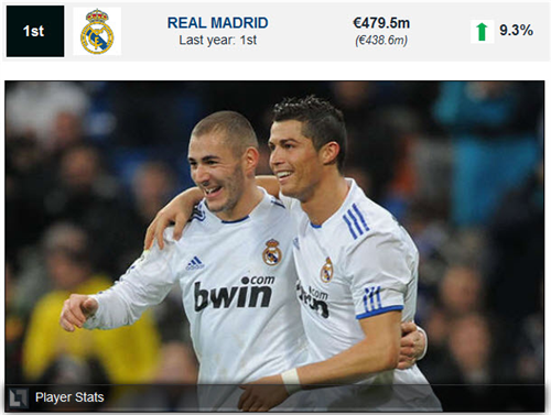 1. Real Madrid បានធ្វើអោយប្រាក់ចំណូលប្រចាំឆ្នាំចុងក្រោយនេះ មានការកើនឡើង ចាប់ពីឆ្នាំ 2007 មកម៉្លេះ។ ក្នុងឆ្នាំ 2010-11 ប្រាក់ចំណូលរបស់ Real Madrid បានរហូតដល់ 9.6%។