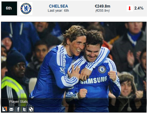 6. តោខៀវ Chealsea ក្នុងឆ្នាំ 2009-10 ទទួលបានចំណូល � 255.9 million អ្នកដឹកនាំក្លឹប Chealsea បានមានប្រសាសន៍ថា ប្រភពចំណូលរបស់ Chealsea ប្រចាំឆ្នាំ 2010-11 គឺបានមកពីការផ្សាយបន្តផ្ទាល់ទូរទស្សន៍ច្រើនជាងគេ។ ប៉ុន្តែយ៉ាងណាក្តីចំណូល របស់ Chealsea ក៏នៅតែធ្លាក់ចុះដល់ � 16.9 million ស្មើនឹង 2.4% បើធៀបទៅនឹងឆ្នាំ2009-10។