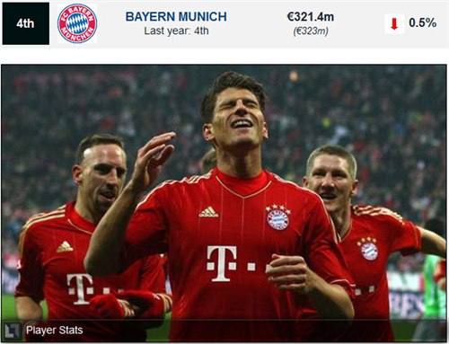 4. Bayern Munich ចំណូលក្នុងឆ្នាំ 2010-11 មានការធ្លាក់ចុះ � 1.6 million ស្មើនឹង 0.5% បើធៀបទៅនឹងប្រាក់ចំណូលឆ្នាំ 2009-2010។