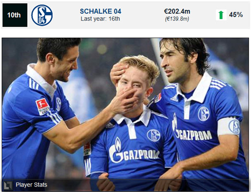 10. Schalke 04 ក្នុងឆ្នាំ 2010-11 ទទួលបានចំណូល � 202.4million ស្មើនឹង 45% បើធៀបទៅនឹងឆ្នាំ2009-10។