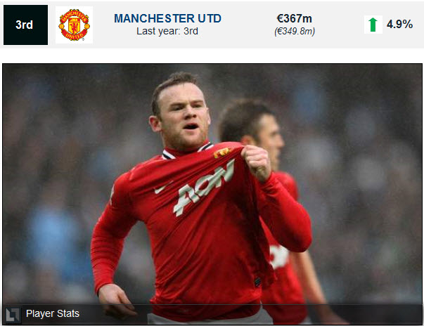 3. ស្របជាមួយគ្នានេះផងដែរ Manchester United ដែលជាក្រុមមួយដែលធ្លាប់តែល្បី ក្នុងវិស័យបាល់ទាត់របស់អង់គ្លេសបានធ្លាក់មកដល់លេខ3។ ហើយទទួលបានប្រាក់ ចំណូលត្រឹមតែ � 17.2 million ស្មើនឹង 4.9% តែប៉ុណ្ណោះ។