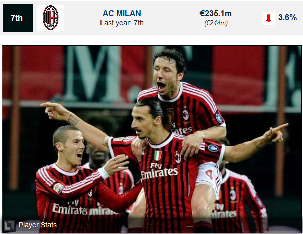 7. AC Milian ជាក្លឹបដែលទទួលបានប្រាក់ចំណូលច្រើនជាងគេក្នុងចំណោមក្លឹបទាំងអស់ ក្នុងប្រទេសអ៊ីតាលី។ ឆ្នាំ 2010-11 នេះទទួលបានប្រាកចំណូល � 235.1 million មានការធ្លាក់ចុះ 3.6% បើធៀបទៅនឹងឆ្នាំ 2009-10 ដែលទទួលបានចំណូល � 244 million។