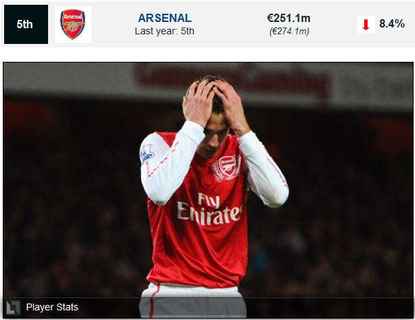 5. កាំភ្លើងធំ Arsenal ចំណូលក្នុងឆ្នាំ 2010-11 មានការកើនឡើង � 23 million ស្មើនឹង 8.6% បើធៀបទៅនឹងឆ្នាំ 2009-10។