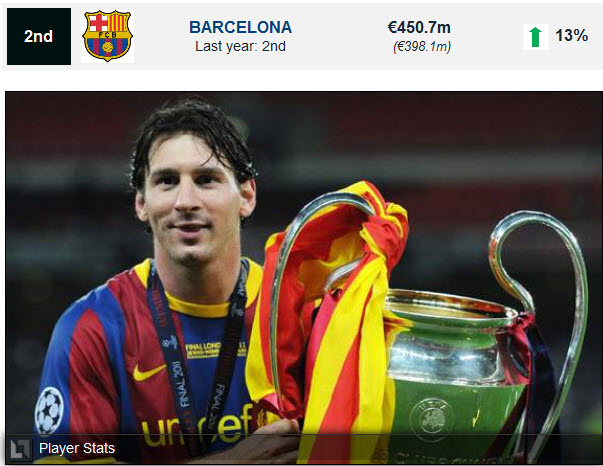 2. Barcelona ទទួលបានប្រាក់ចំណូលចំនួន � 83.7million ស្មើនឹង 13% ក្នុងឆ្នាំ 2010-11 បើធៀបទៅនឹងឆ្នាំ 2009-10 ទទួលបាន � 48.3million។