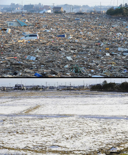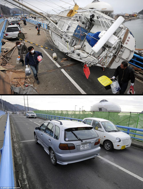 ជ្រុងមួយនៃក្រុង Kesennuma ក្នុង និងក្រោយថ្ងៃមហាគ្រោះធម្មជាតិ
