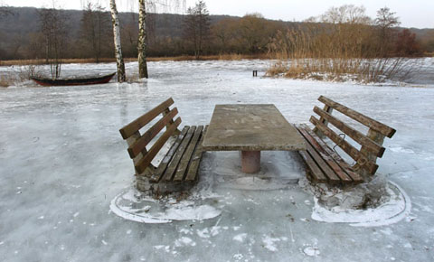 តុ និងកៅអីក្នុងទឹកជំនន់ដែលបានកកជាទឹកកក នៅ Hirschfeld ភាគ