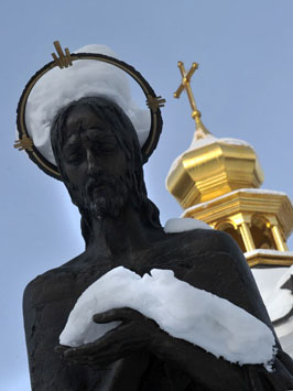 ព្រិលបានកកនៅលើរូបសំណាកនៃព្រះយេស៊ូ នៅអ៊ុយក្រែន។
