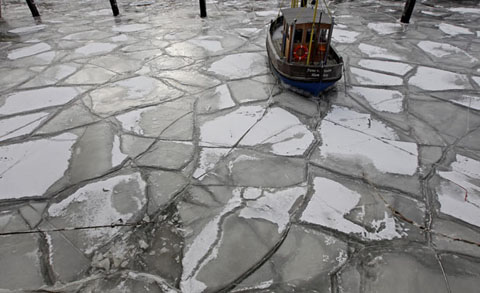 ទូកធំមួយគ្រឿងត្រូវជាប់នៅលើទឹកទន្លេដែលបានកក នៅ Hamburg