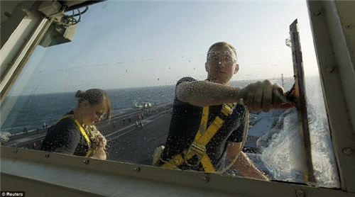 នាវិកអាមេរិក កំពុងលាងកញ្ចក់លើនាវា USS Abraham Lincoln